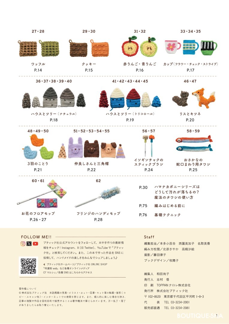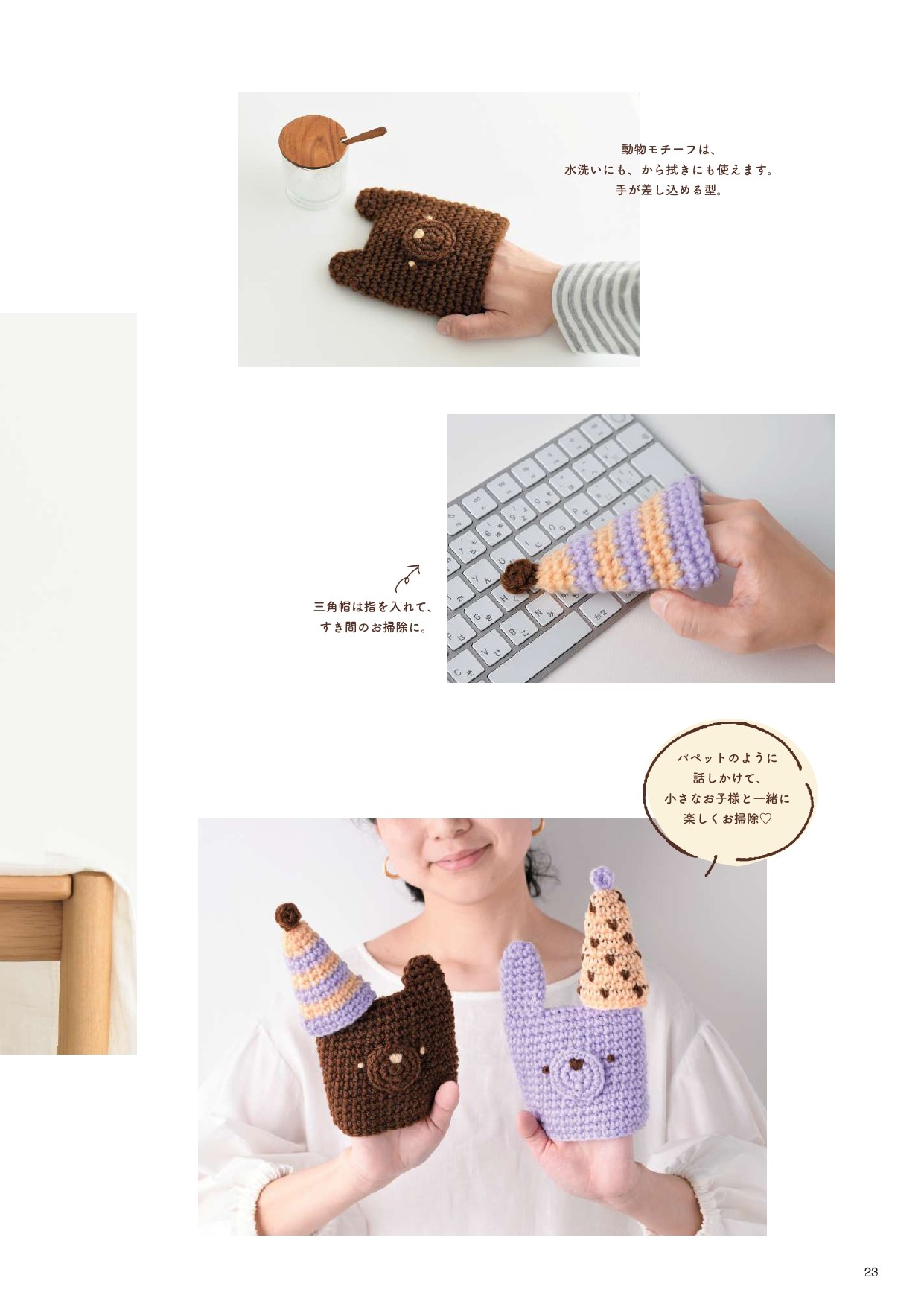 アクリル毛糸で編んだ「魔法のタワシ」は、洗剤なしで汚れを落とせる、環境にやさしいエコなアイテム。キッチンをはじめとする水まわりはもちろん、リビングやデスクまわりなど、いつでもさっと掃除ができるように飾りながら使える、かわいくて実用的なデザインを紹介。すべて編み方解説つき。 (H103-296)