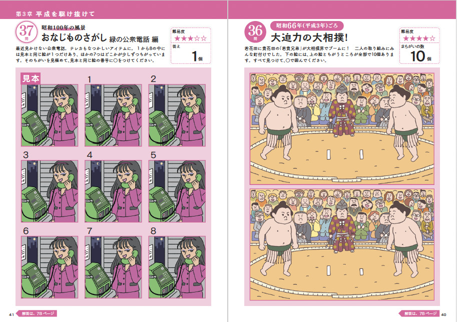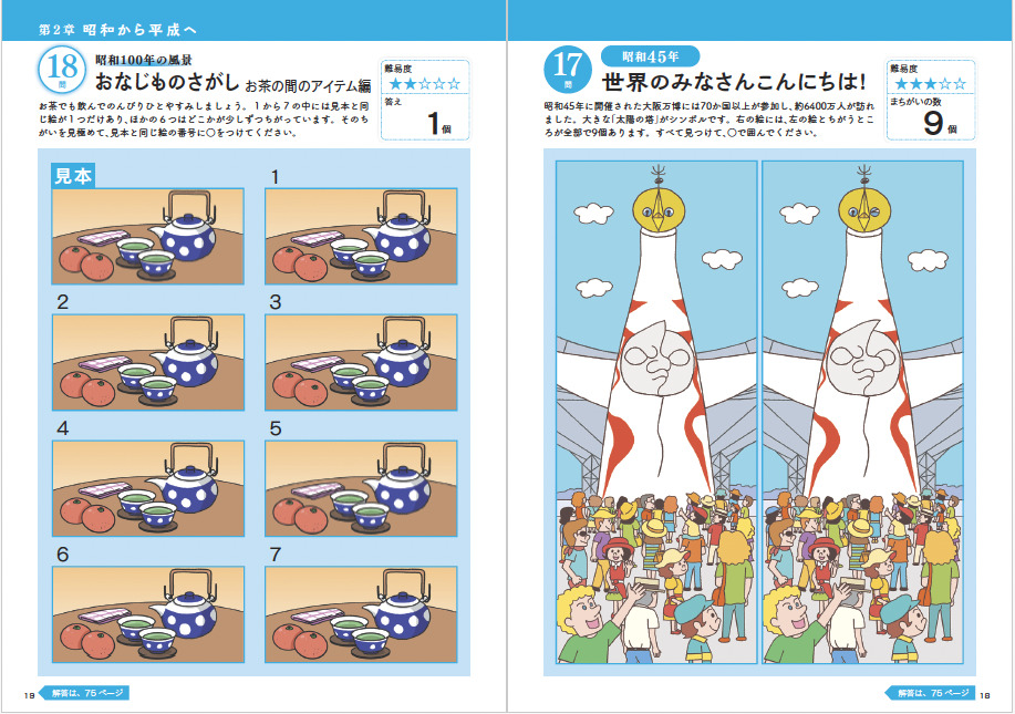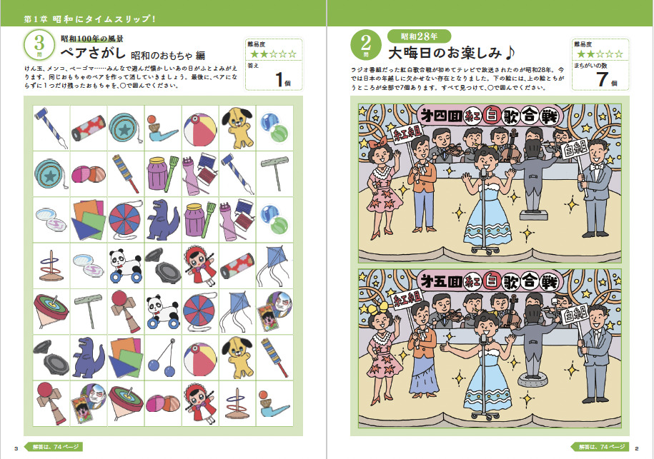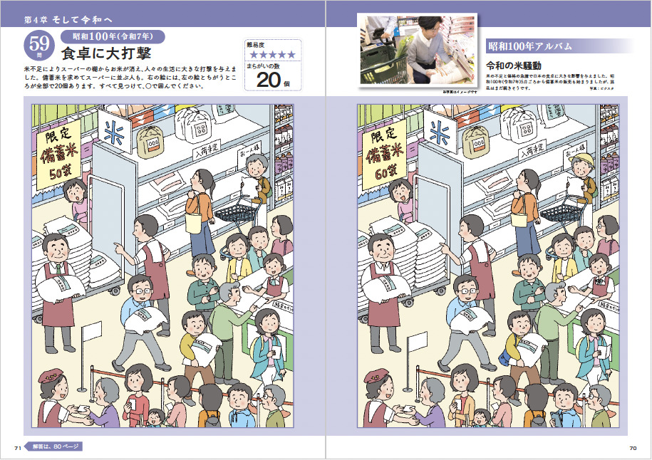 令和7年の今、空前の「昭和ブーム」が巻き起こっています。そして、2025 年の今年は「昭和100年」という記念すべき年です。本企画は、激動の昭和時代を生きた中高年に向けて、脳トレとしても人気の高い「まちがいさがし」で、昭和の出来事や暮らしを振り返る内容となっています。 楽しいイラストを見ながらまちがいを探して脳トレにも役立ちます。