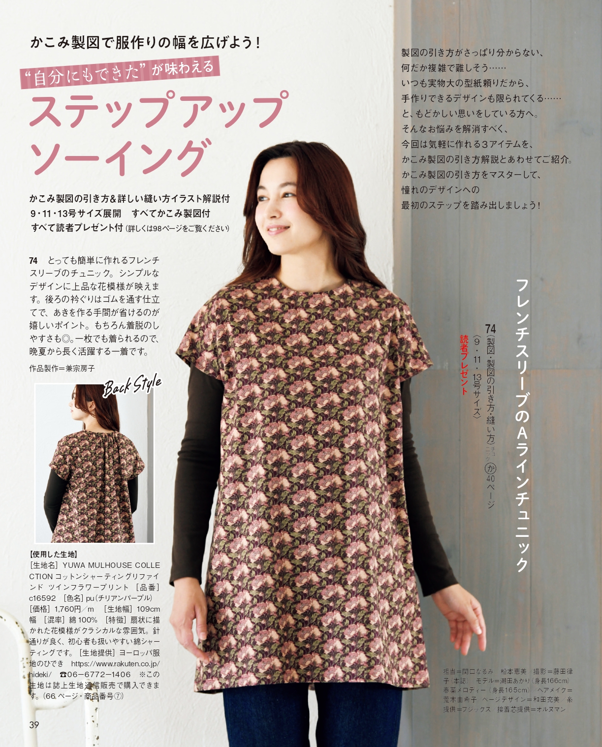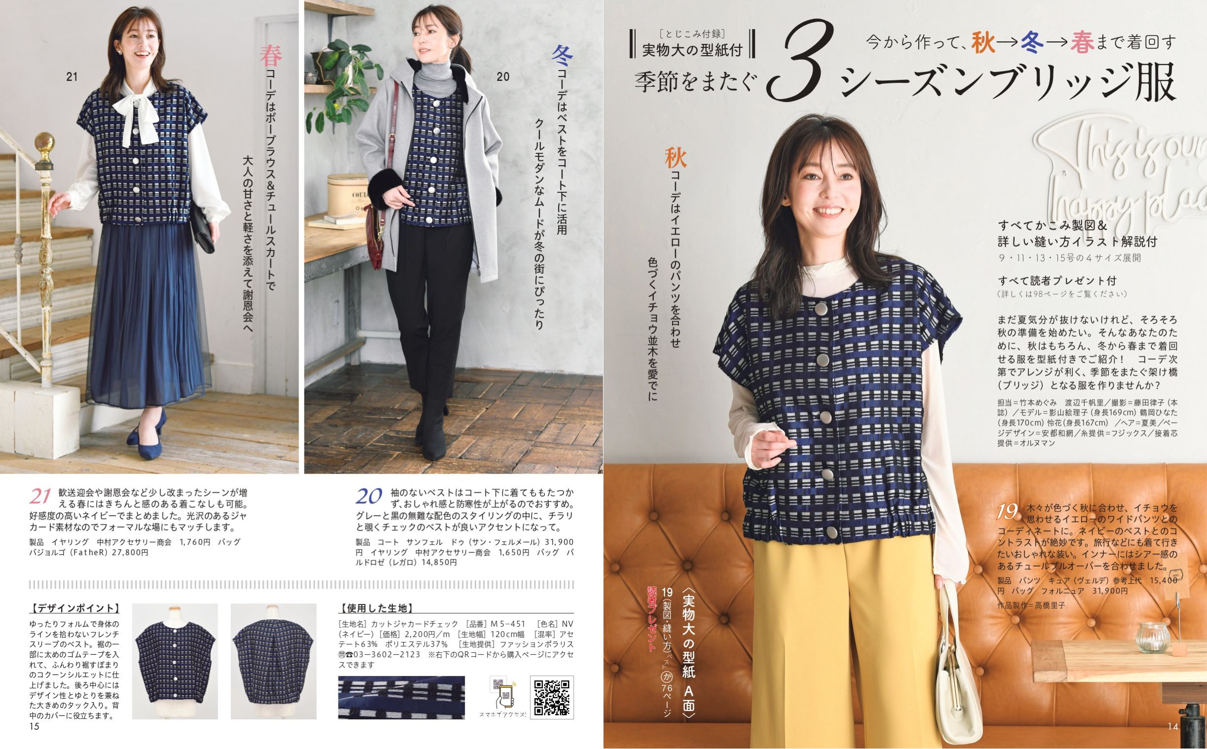 うんざりするような暑い夏の終わりを感じたら、秋に向けて服作りを始めませんか? 春夏に比べて作ることをためらいがちな秋冬服。せっかく作るなら着こなし方次第で秋だけでなく、冬にも春にも着られる服はどうでしょう? 小粋なレイヤードスタイルが楽しめるベスト、大人のデイリーウエアにぴったりのダンガリーシャツ、アーティスティックな花柄のワンピース、トレンド感のあふれるコクーンパンツの4型を、9〜15号サイズの実物大の型紙&詳しい縫い方解説付きでお届けします!