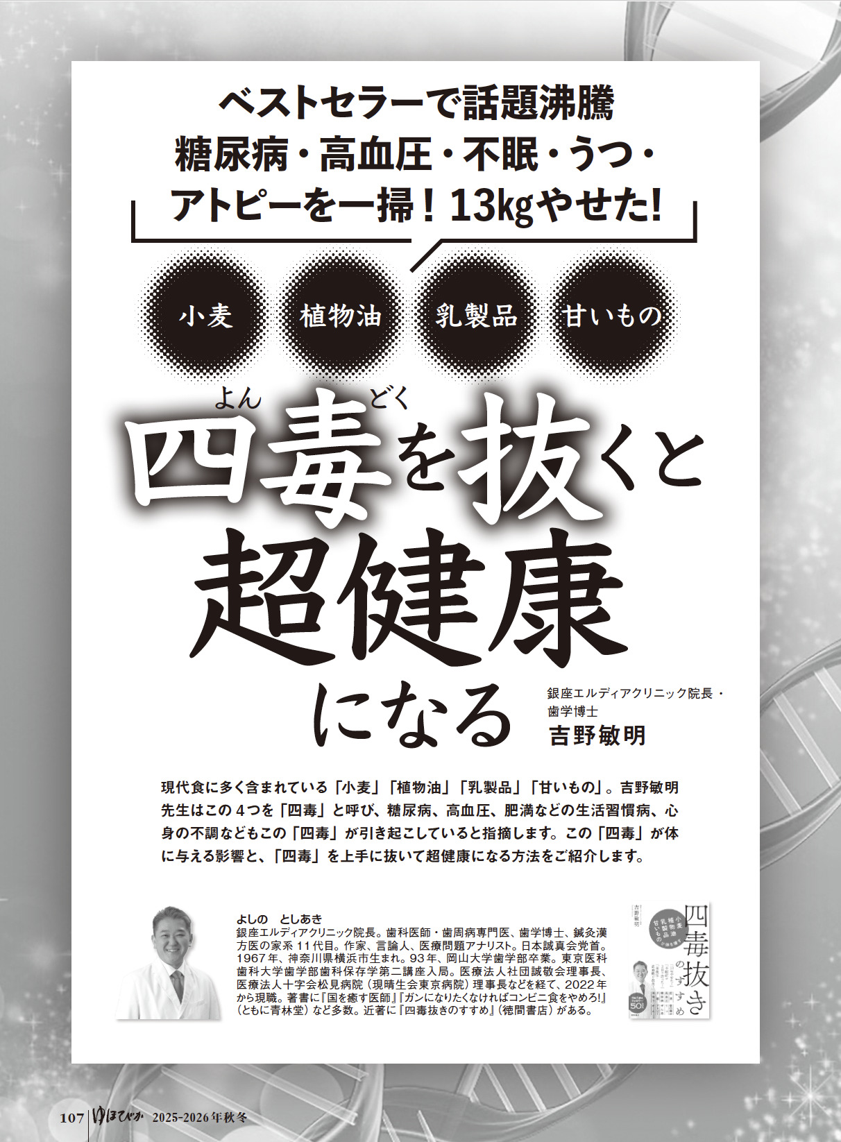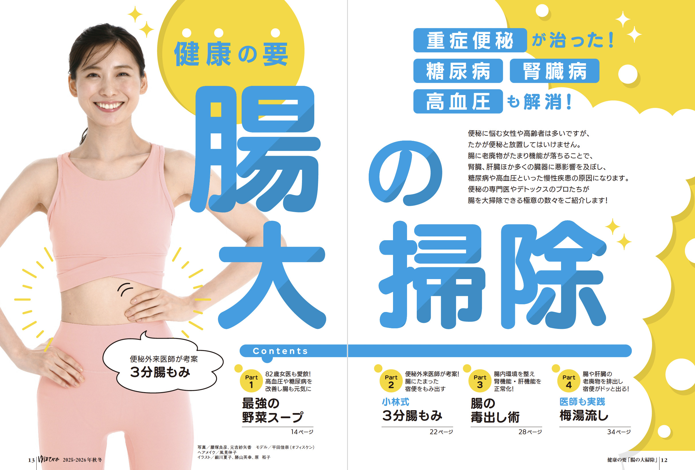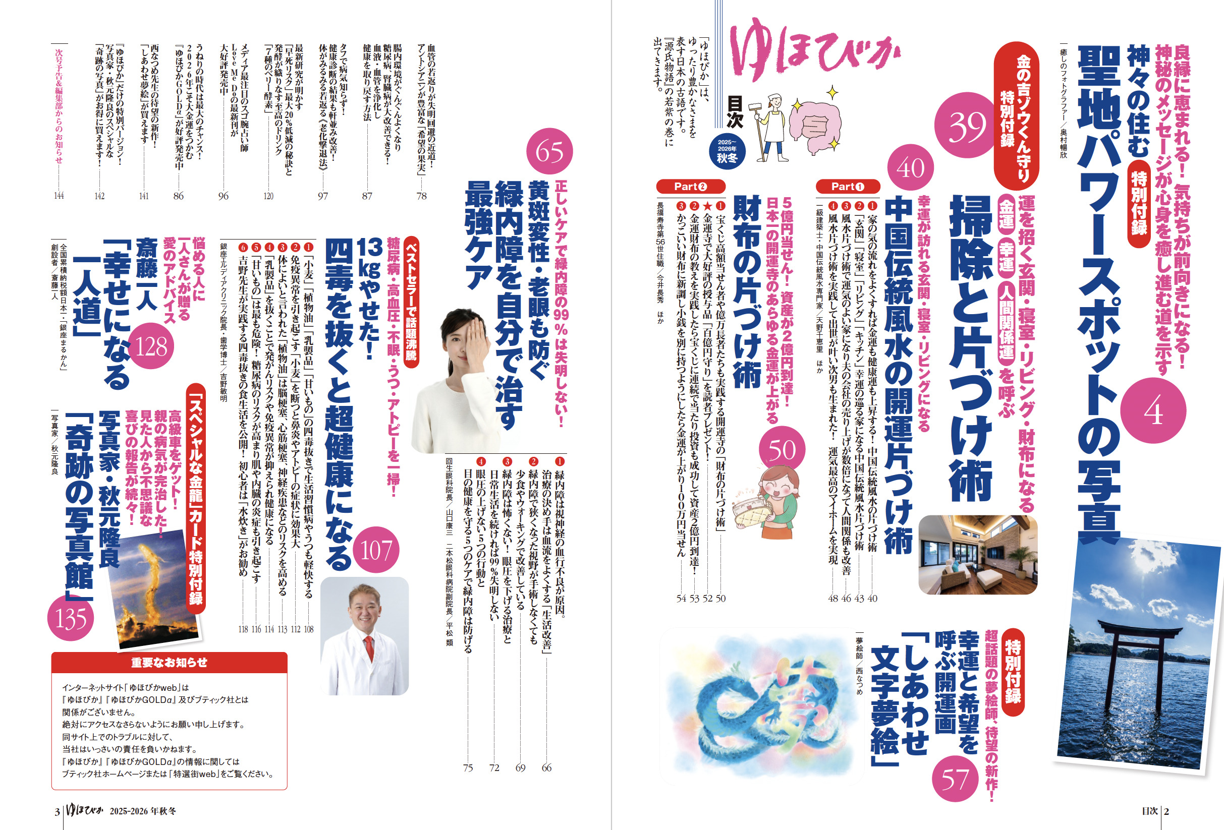 健康な心身は「腸」から――。便秘やガス腹が続くような腸は、糖尿病、高血圧、腎臓病、肝機能障害、肥満などの慢性的な病気や、うつなどの心の病まで引き起こしてしまいます。健康長寿の秘訣は、とにかく「腸」を健康に保つこと。腸の専門医や名治療家、研究家たちが、腸に効く食事、腸マッサージ、押すと宿便が出る腸の特効ツボなど、自分で簡単に腸を健康にできる手法をご紹介します!「スーパーに並んでいる食品はほとんど毒!」と、今、世間を騒がせている「四毒」の話や、あやゆる運が上がる開運「掃除と片づけ術」など、見逃せない特集が目白押し。奇跡の写真家・秋元隆良の人気作一挙公開も!