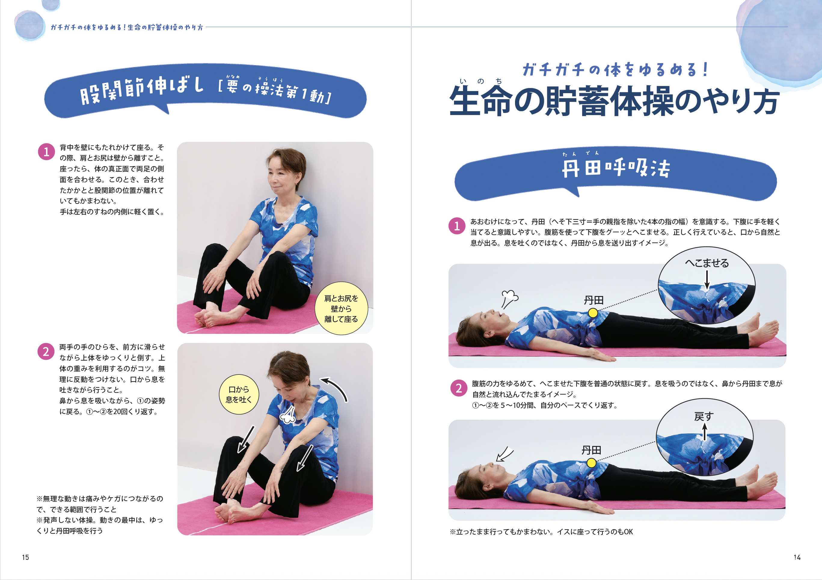 生命の貯蓄体操は、東洋医学の知恵を日常の健康づくりに活用できるように考えられた体操です。「丹田呼吸法」「身体をゆるめる体操」で心と体を整える、誰でもできるセルフケアです。「丹田呼吸」は緊張した心身をほぐし、自律神経を整えてストレスや疲労を解消します。「身体をゆるめる体操」は筋肉の緊張を解き、徐々に関節を柔軟にすることで体のゆがみを調整します。ゆるんだ筋肉はポンプの役目を果たし、内臓や手足の末端まで血液を巡らせるのです。