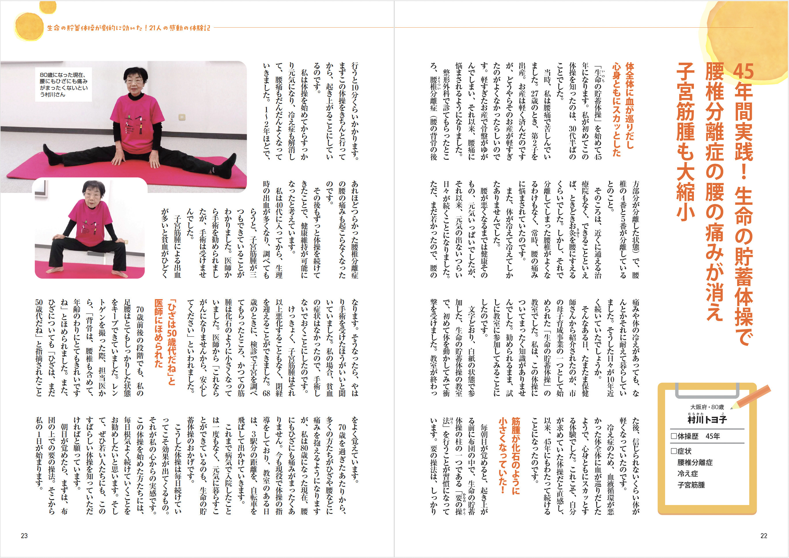 メインとなる体操は「要の操法」と「五導術」の二つですが、本書では、自宅でもできる簡単な体操のやり方を紹介しています。教室に通う21名の方々の体験記も紹介しています。それを参考に、ぜひみなさんも生命の貯蓄体操を始めてみてください。何歳から始めても遅いということはありません。実際、80代や90代でベターッと開脚できるくらい、体が柔軟になり、若返った方がたくさんいるのです。