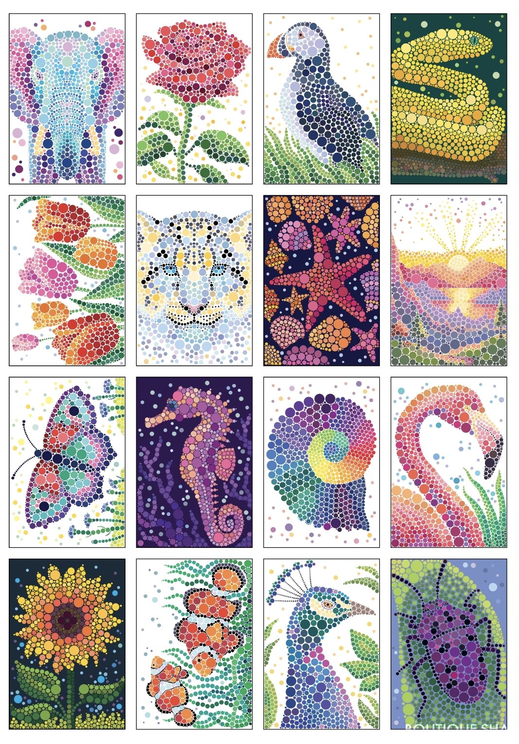 丸シールで、動物や自然の風景20作品を完成させましょう!