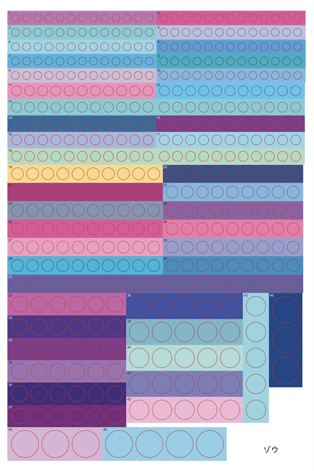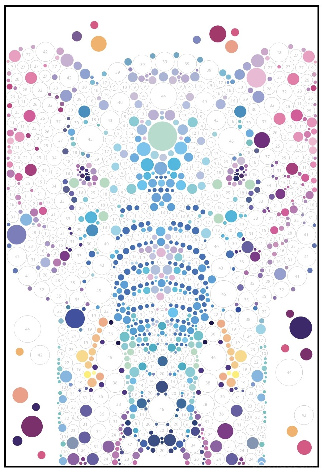 イラストは、さまざまなサイズの”丸”で構成されています。 その中には、色がついている丸や、数字が書かれている丸があります。