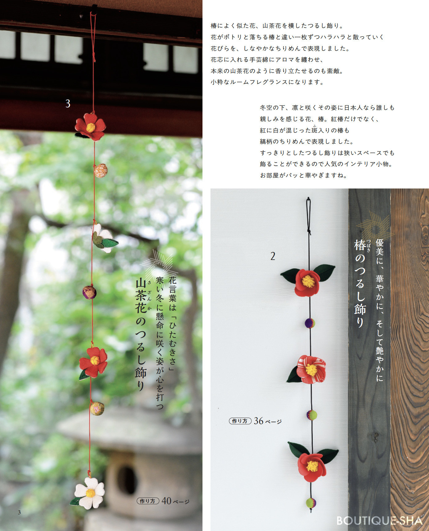 椿、梅、桜、牡丹、花菖蒲、紫陽花、朝顔、向日葵、菊、紅葉、ポインセチア……。春夏秋冬、日本の季節を感じられる花々を手作りできるこもの集。タペストリーやリース、置き物などにアレンジした作品を掲載。既刊の隔月刊誌レディブティックに掲載した作品の中から人気作品を厳選。
