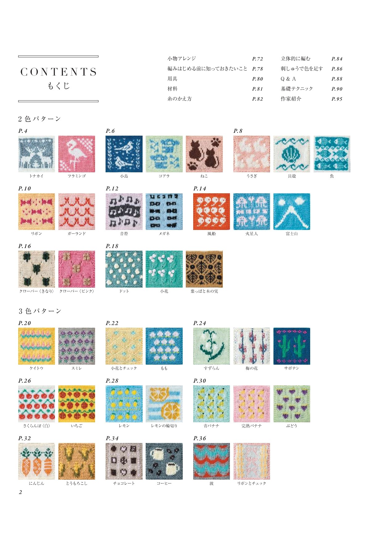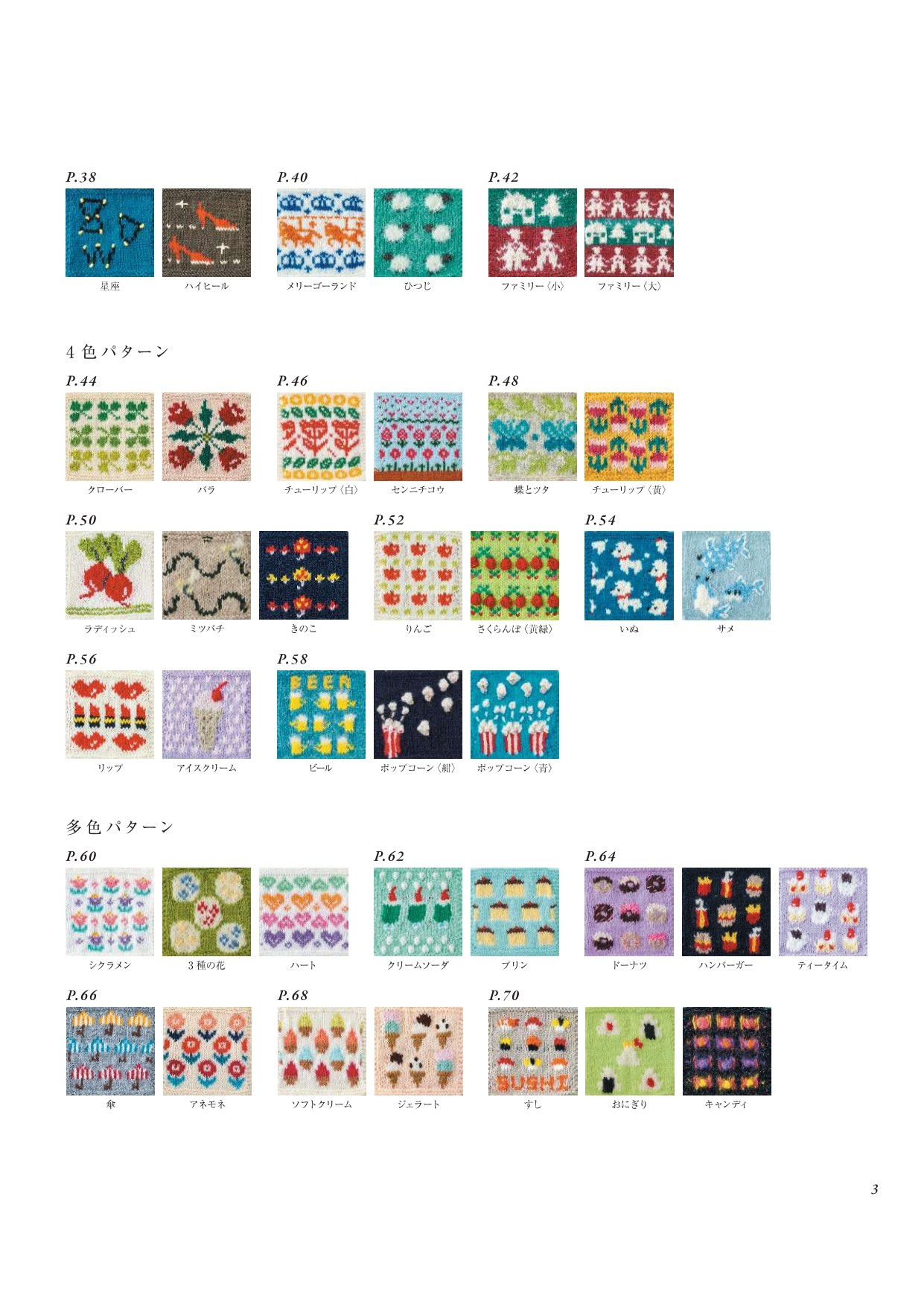 棒針編みの編み込み模様を集めたパターン集。使用する色数ごとに、1色から5色までテーマ別に紹介。食べ物や動物、花など、多彩なモチーフをかわいらしい色使いでデザイン。5色以上を使った華やかな多色作品も掲載。全ページオールカラーなので、色数の多い模様も見やすく、初心者から上級者まで楽しめる一冊。