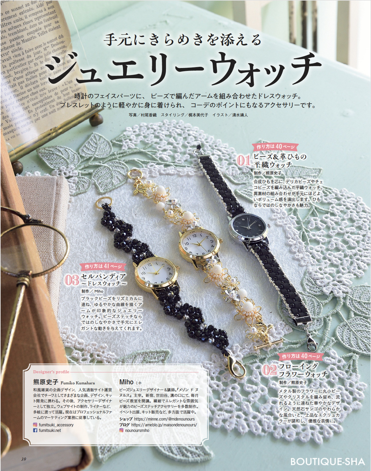 手元に華やぎを装う ジュエリーウォッチ/ビーズレーシング/佐々木公子さんが作る いちごベアー/同窓会で着けたいアクセサリー/ステッチで紡ぐ春のアクセサリーなど