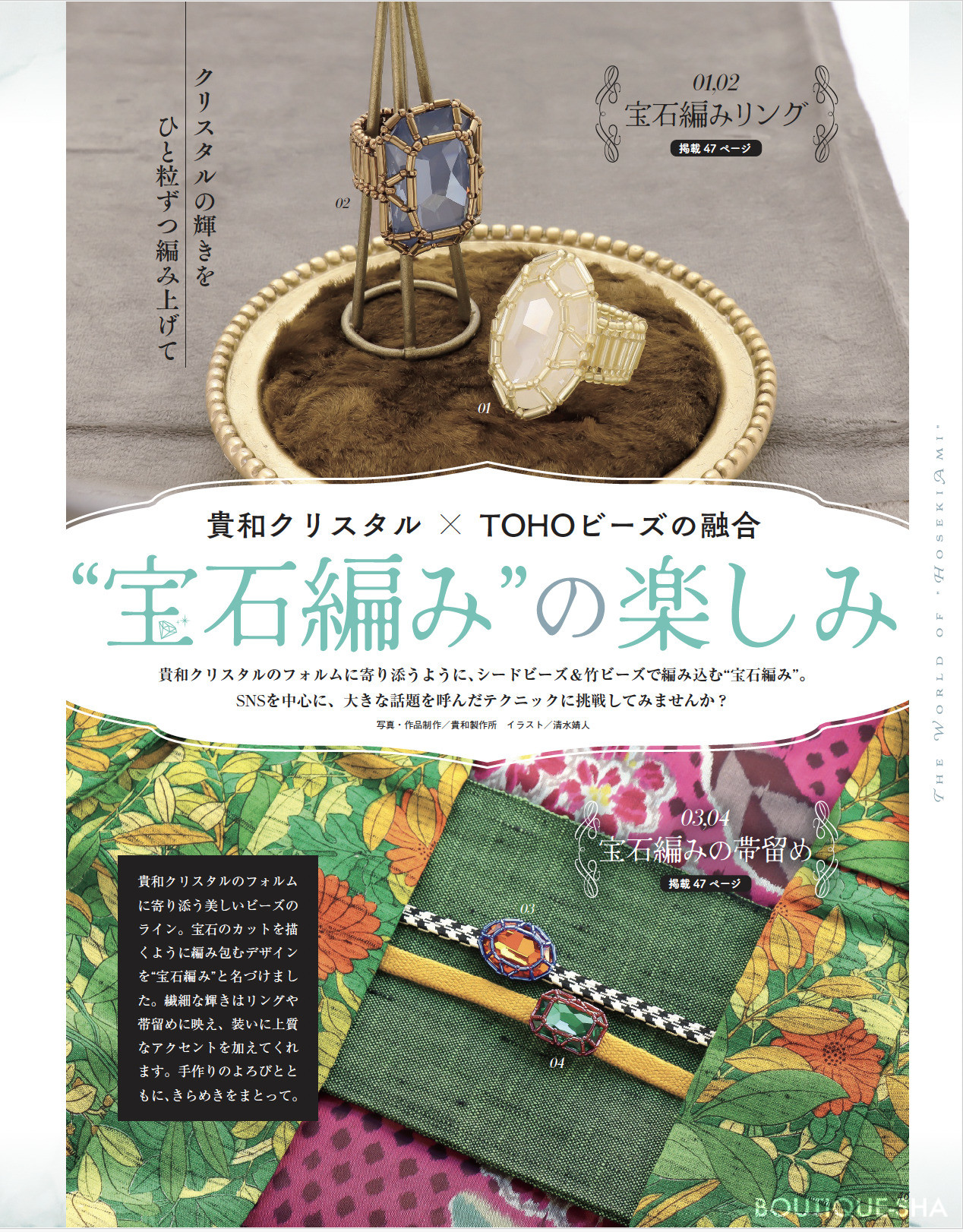 フォーマルにもぴったりきらめきパールアクセサリー/周藤紀美恵先生がレクチャー!はじめてのビーズステッチ基本のき /ビーズレーシングで作るスプリングアクセサリー/野末園子先生&MIYUKIビーズのステッチ/春を彩るボタニカルアクセサリー/その他の企画に、利魔先生のリング、下島先生のブローチ、新商品の紹介など、楽しいビーズの情報が満載です。 -