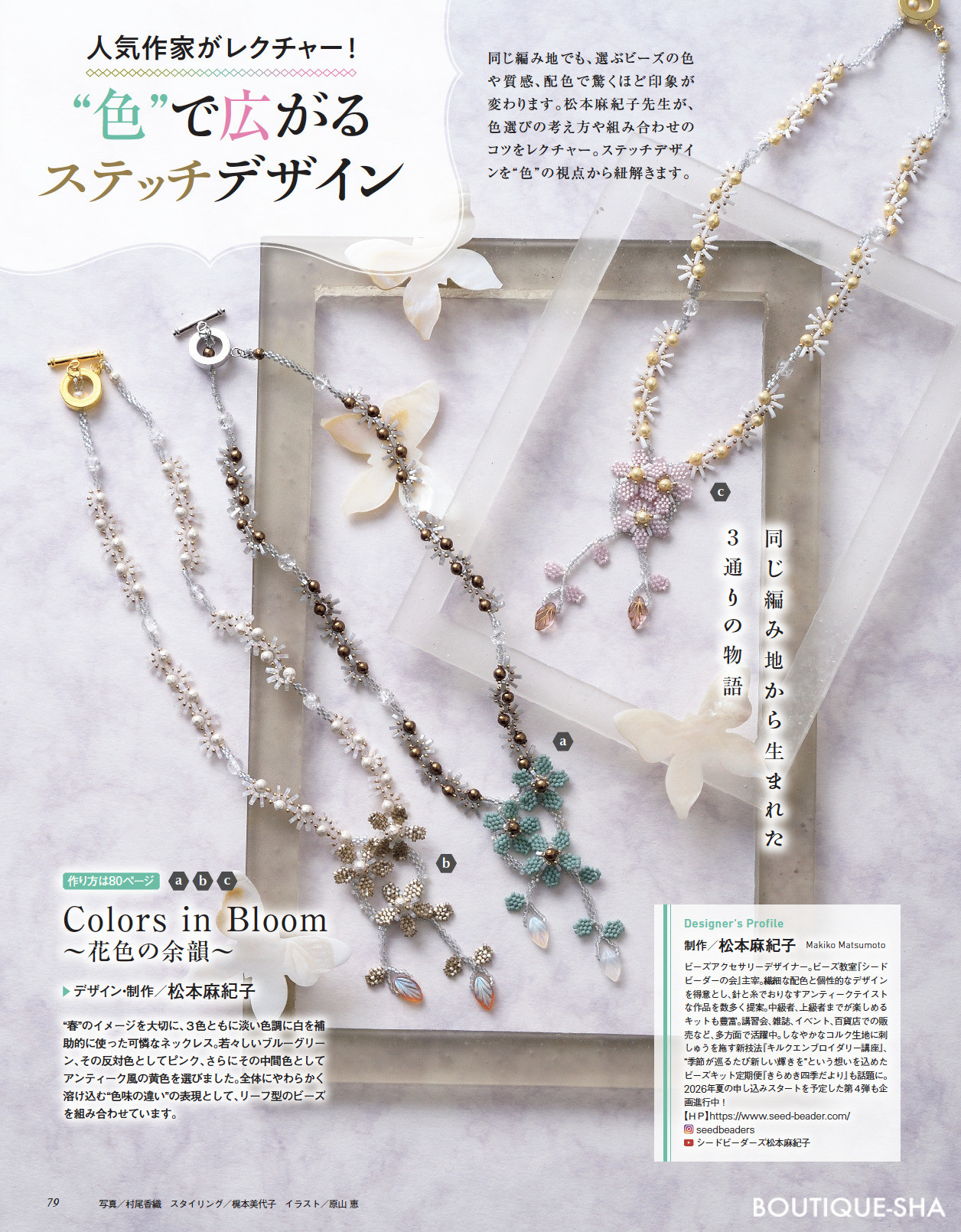 その他の企画に、佐古孝子さんのレポ、日柳佐貴子さんの特集、商品情報などビーズの情報が満載。
