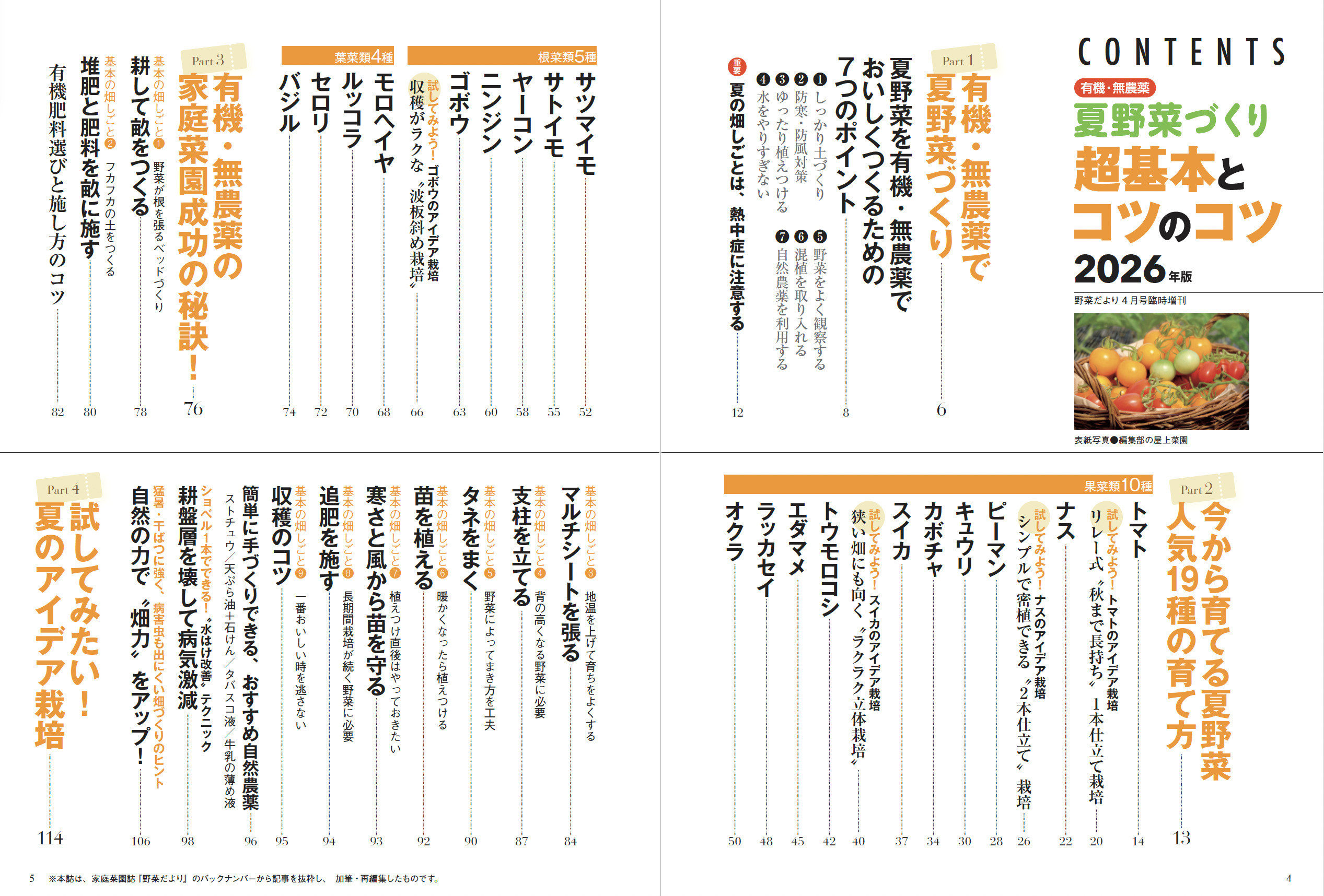 定期誌「野菜だより」の増刊。初心者の方でも簡単に有機無農薬で夏野菜がつくれる基本とコツを既刊の「野菜だより」から記事を抜粋してまとめた一冊の2026年度版。