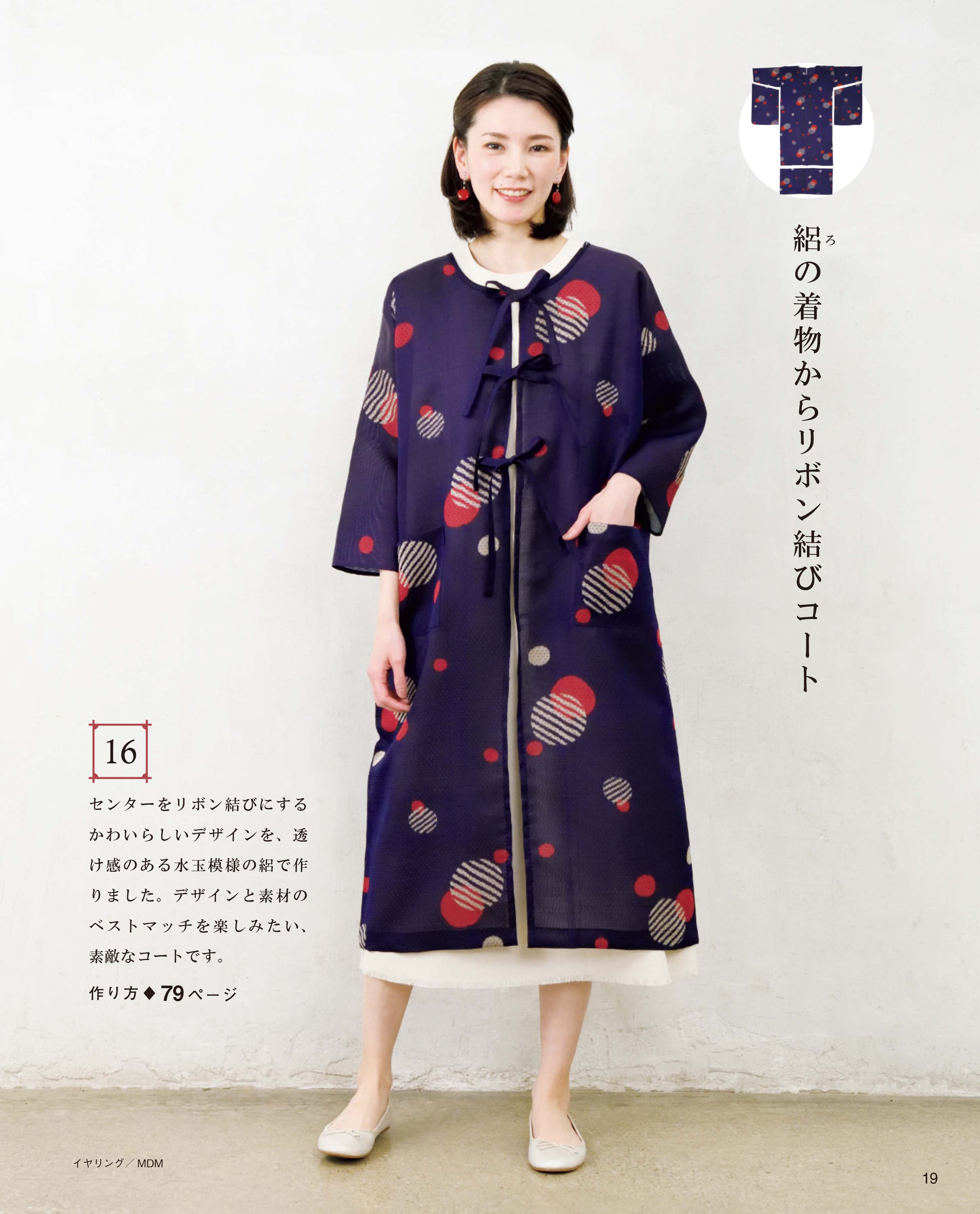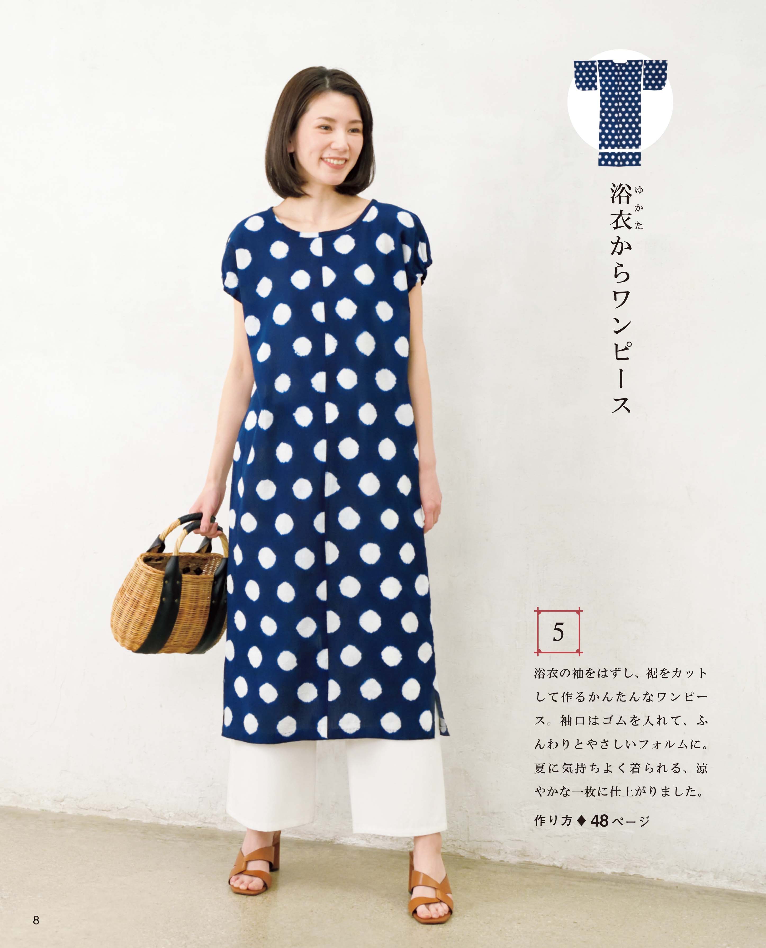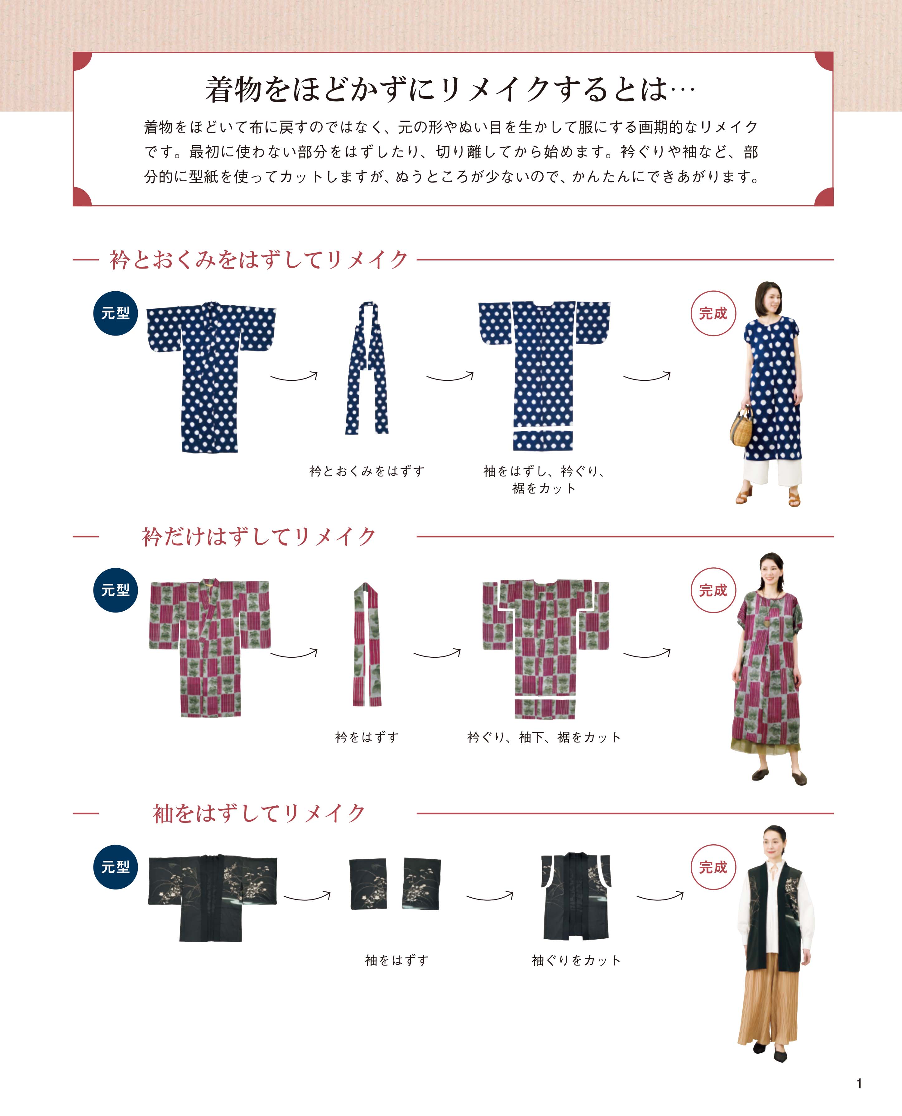 着物をほどかずに、元の形やぬい目を生かしてリメイクする、誰でもかんたんに作れる方法で作品を紹介。ワンピース、チュニック、ボトムなど、ウエアを中心にバッグまで。全27点掲載。