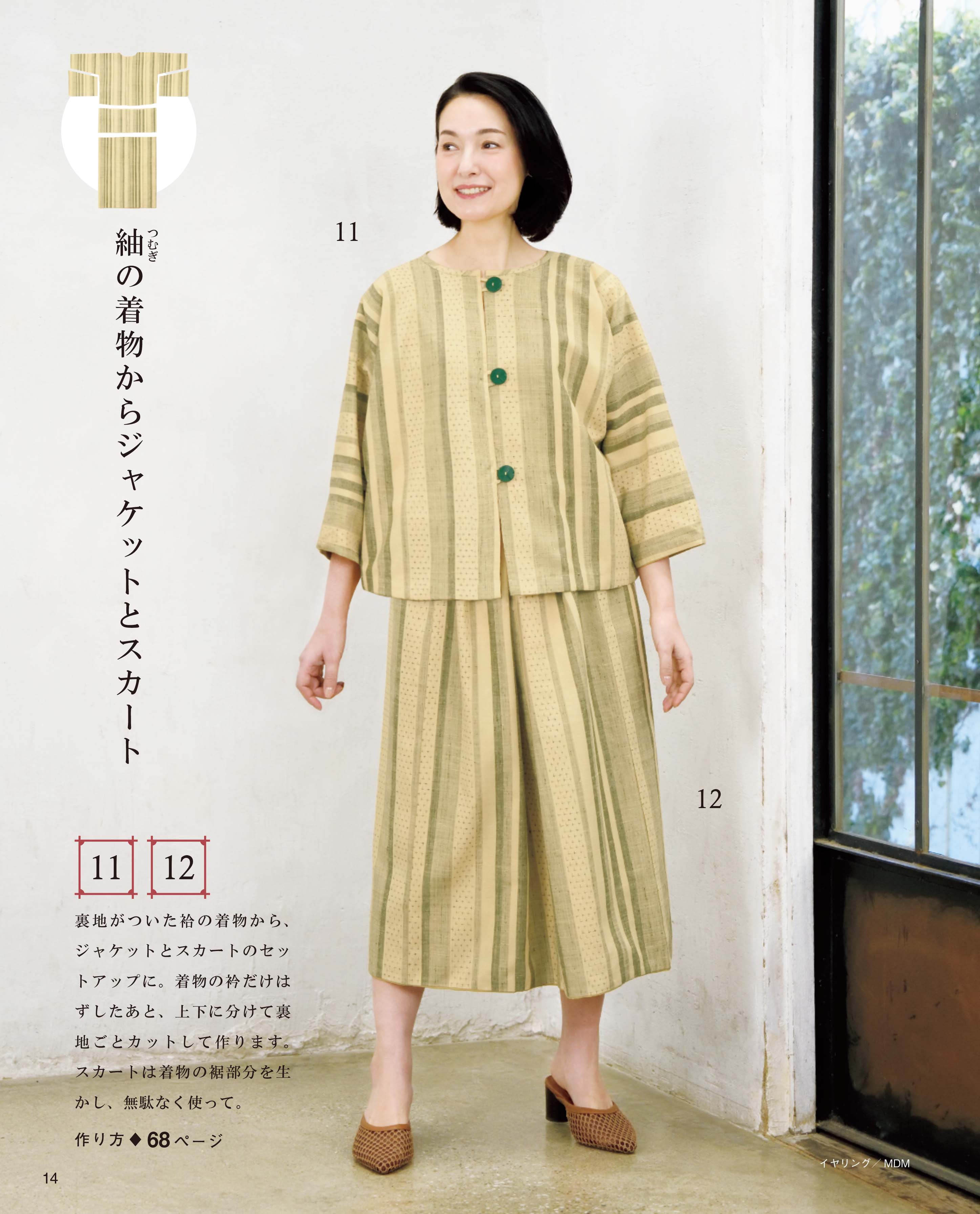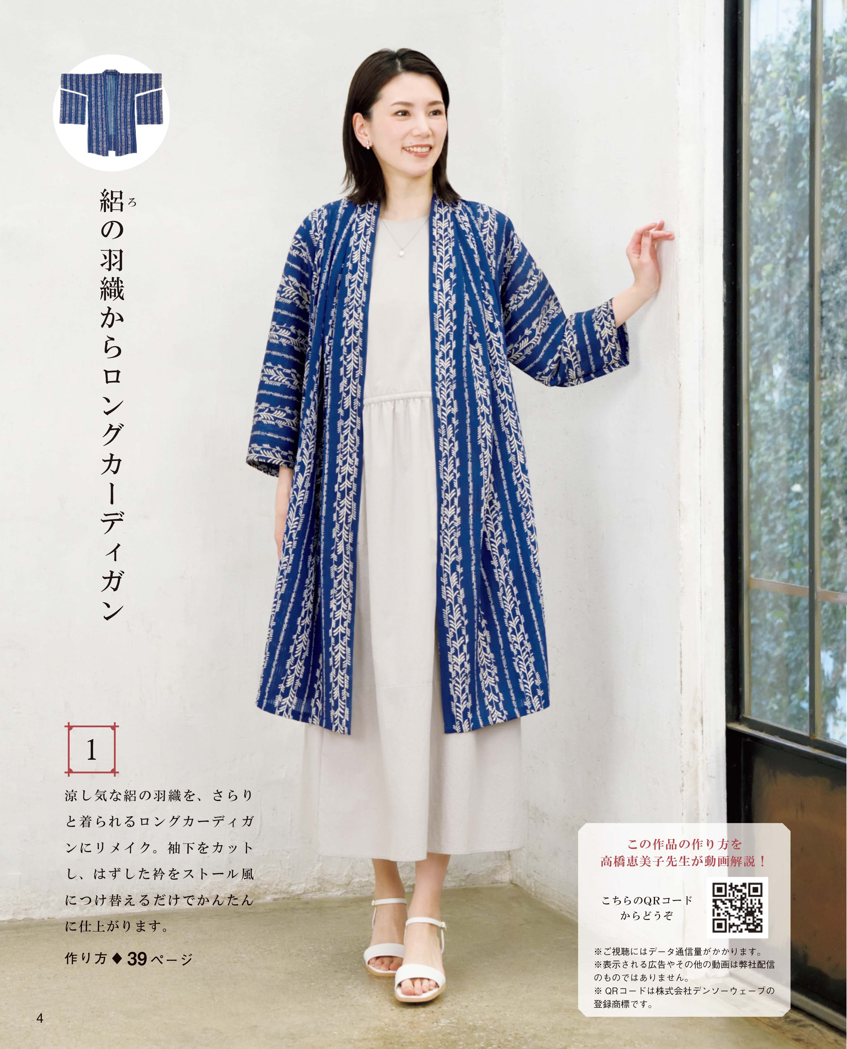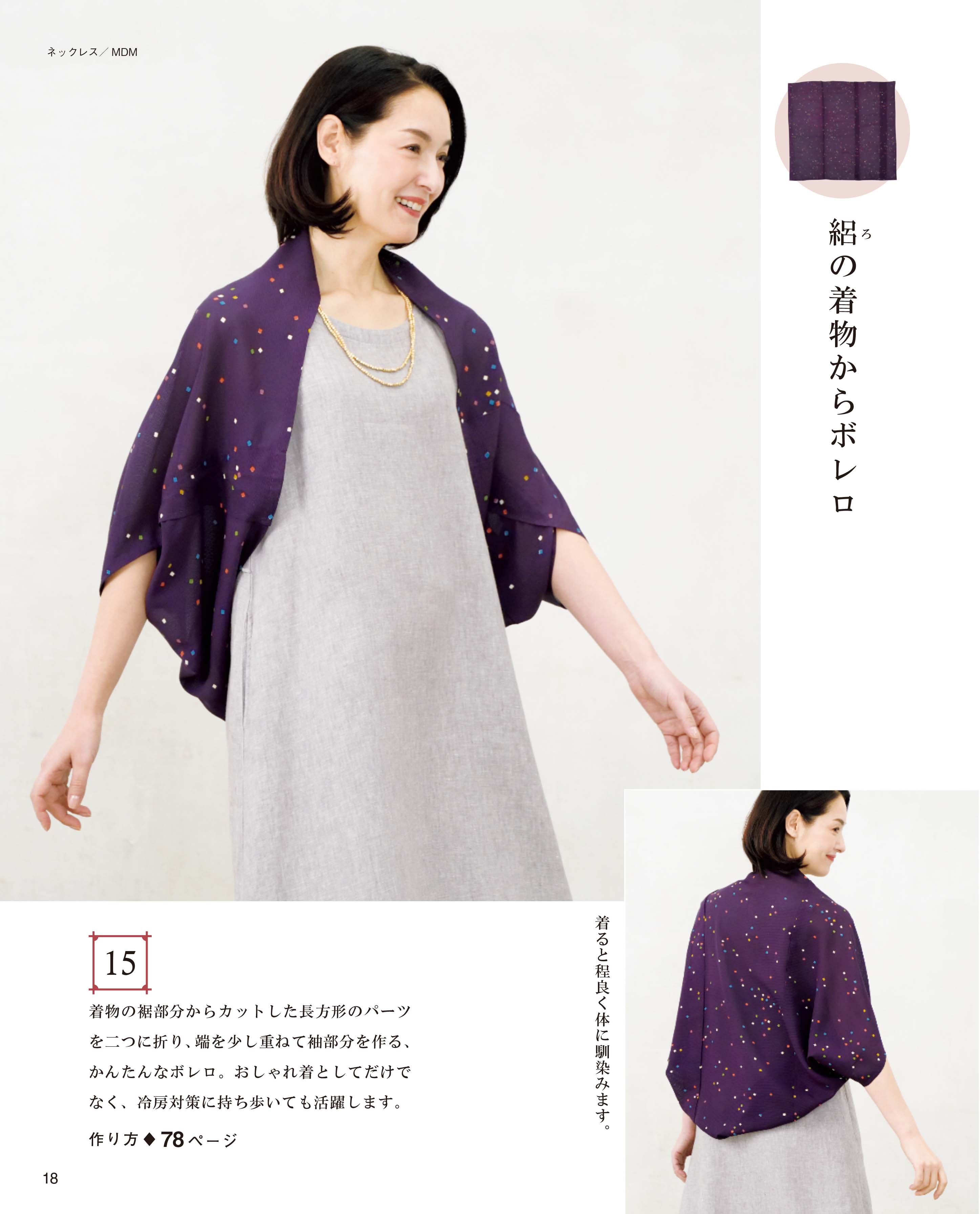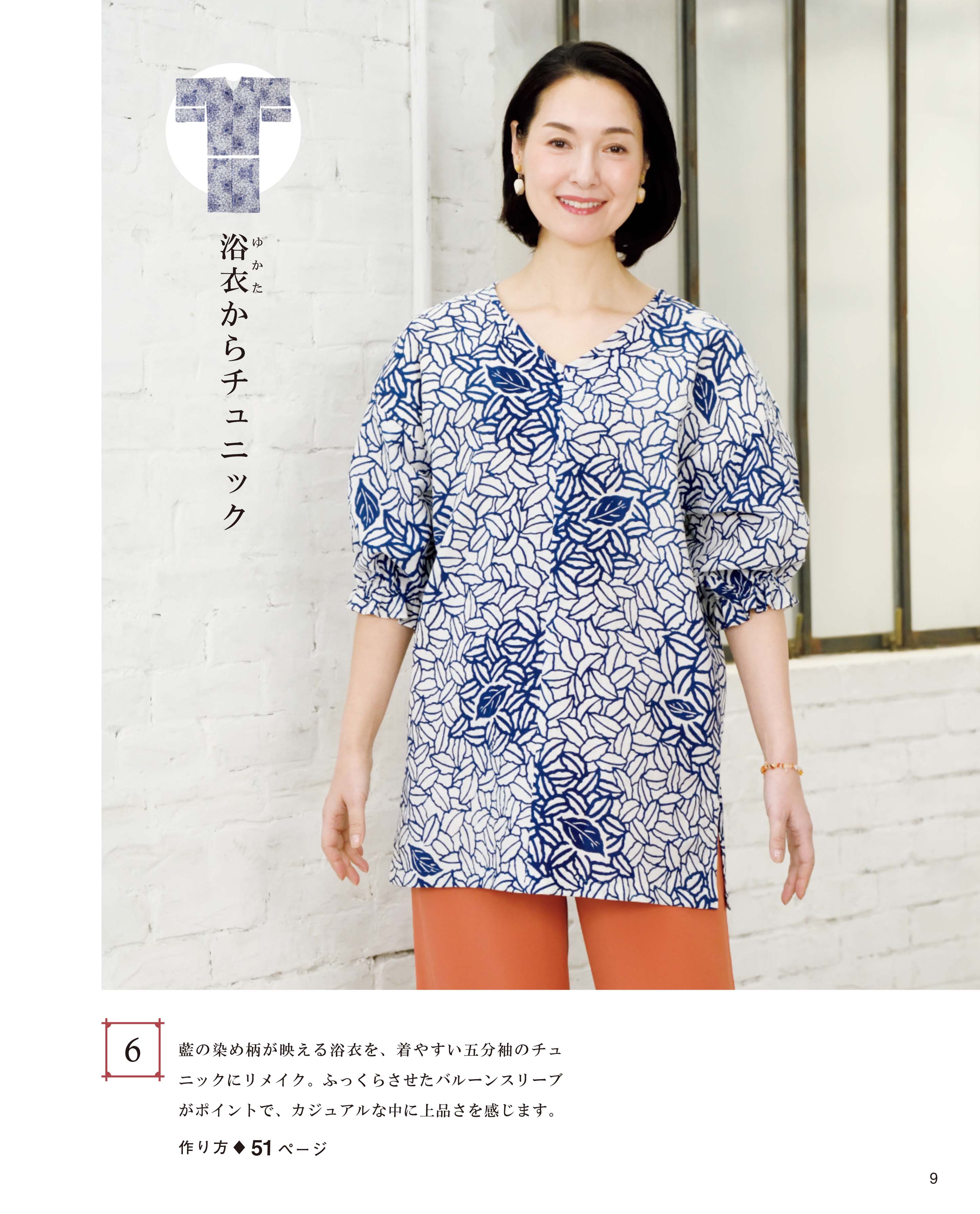 着物をほどかずに、元の形やぬい目を生かしてリメイクする、誰でもかんたんに作れる方法で作品を紹介。ワンピース、チュニック、ボトムなど、ウエアを中心にバッグまで。全27点掲載。