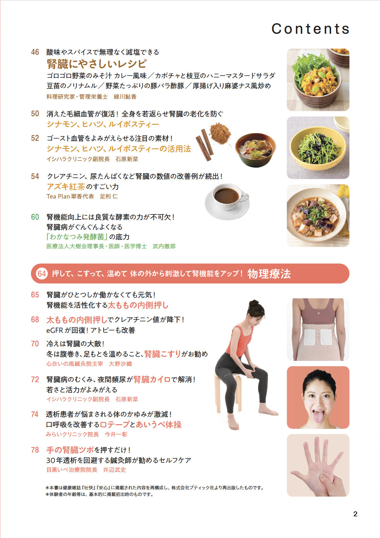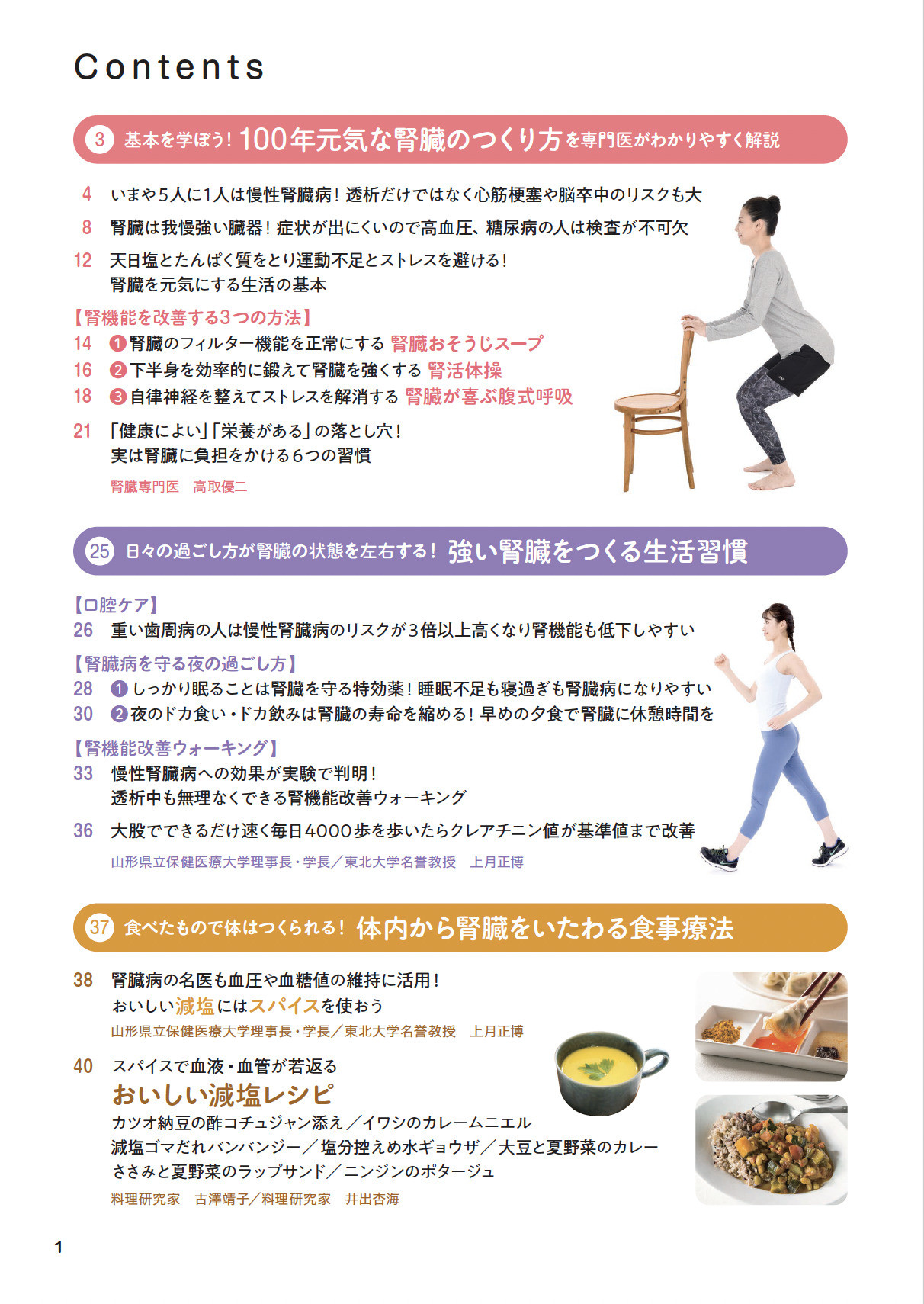 腎機能を維持するための基本は「食事」「運動」「生活習慣」。つまりは毎日の生活の見直しと積み重ね。おいしく食べられる解毒スープ、腎臓が喜ぶ呼吸法、隠れた要因“歯周病”撃退する歯磨きなど、腎臓を元気にするセルフケアを専門家が紹介。