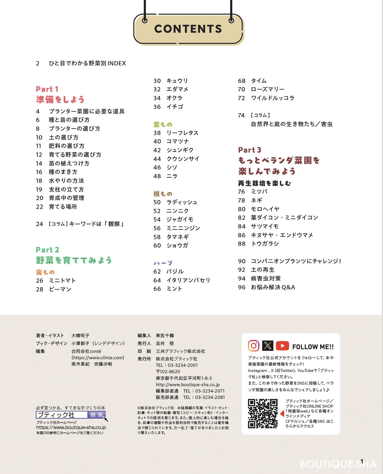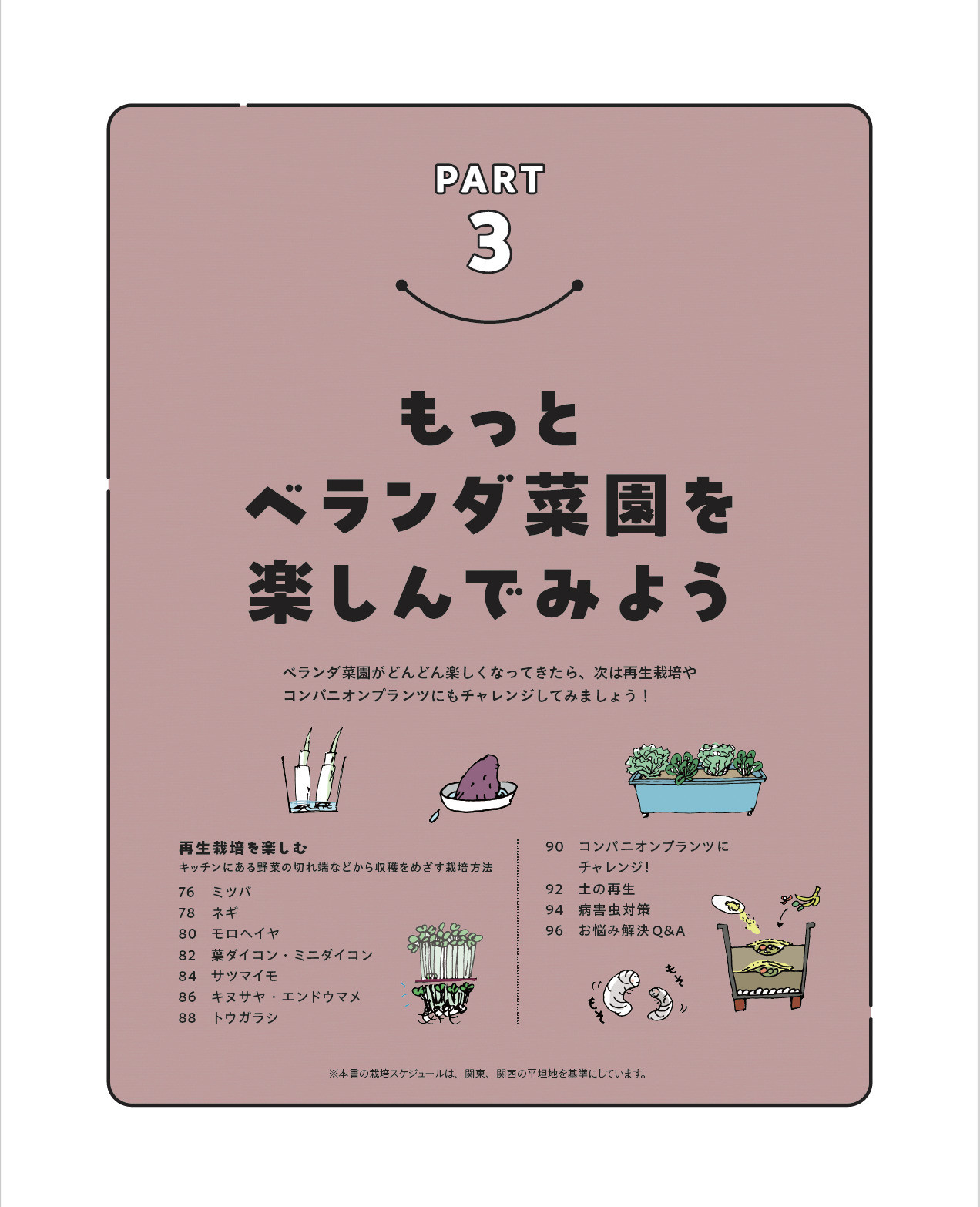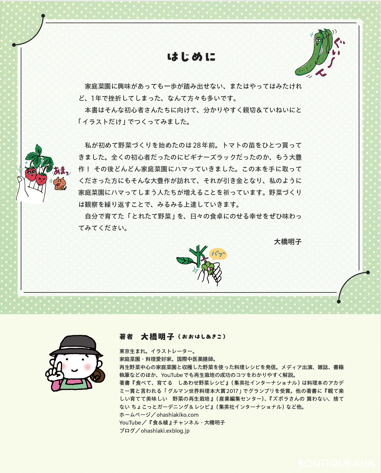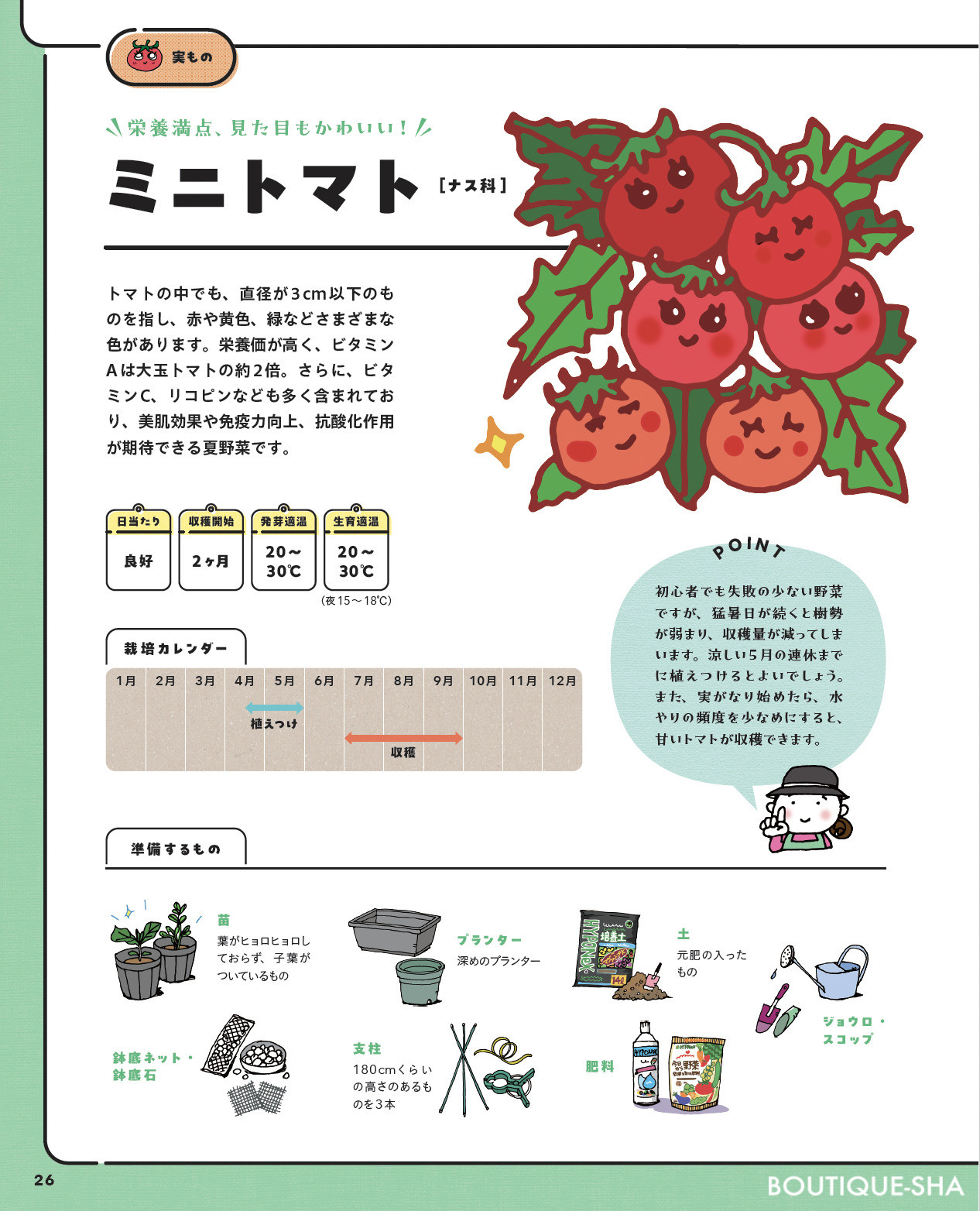 初心者の方にもわかりやすい、イラストで解説したベランダ菜園の本。大橋明子さんのキュートなイラストで癒されつつ、プランターを使った家庭菜園がまるっとわかっちゃう1冊。