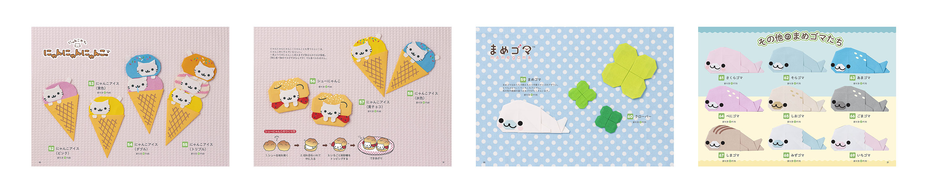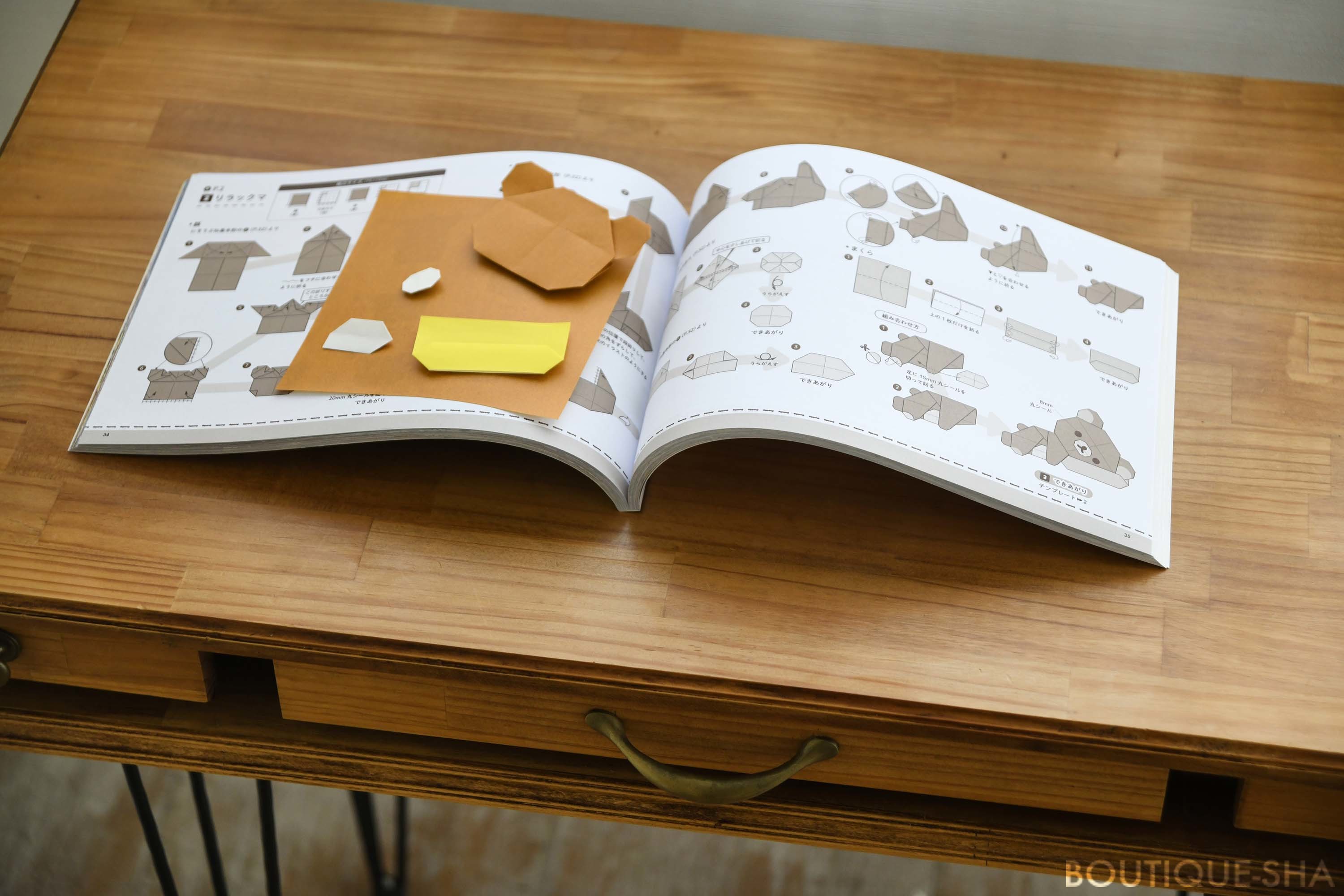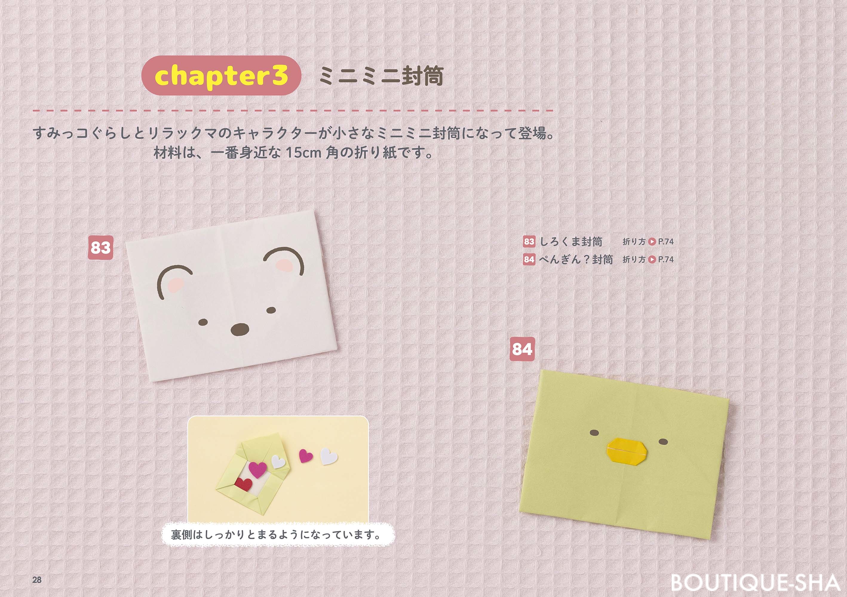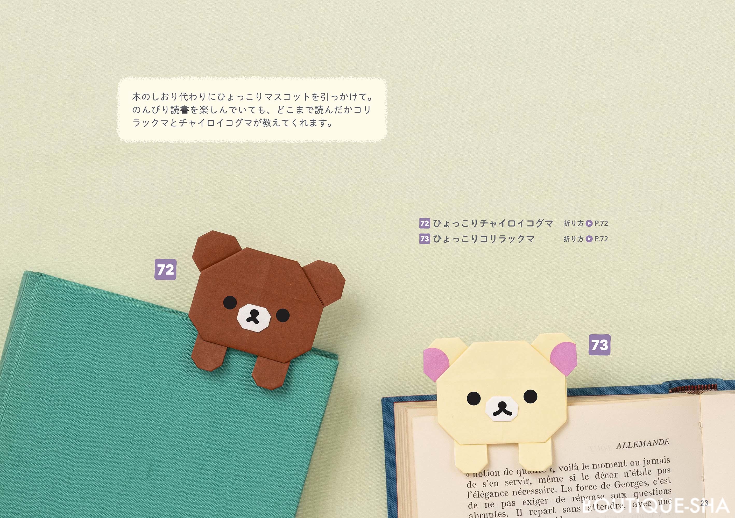 リラックマ、すみっコぐらし、アフロ犬、こげぱん…。この本では、約50種類のサンエックスユニバースの仲間たちを折り方付きで紹介しています。どのキャラクターから折り始めるか悩んでしまいそう!