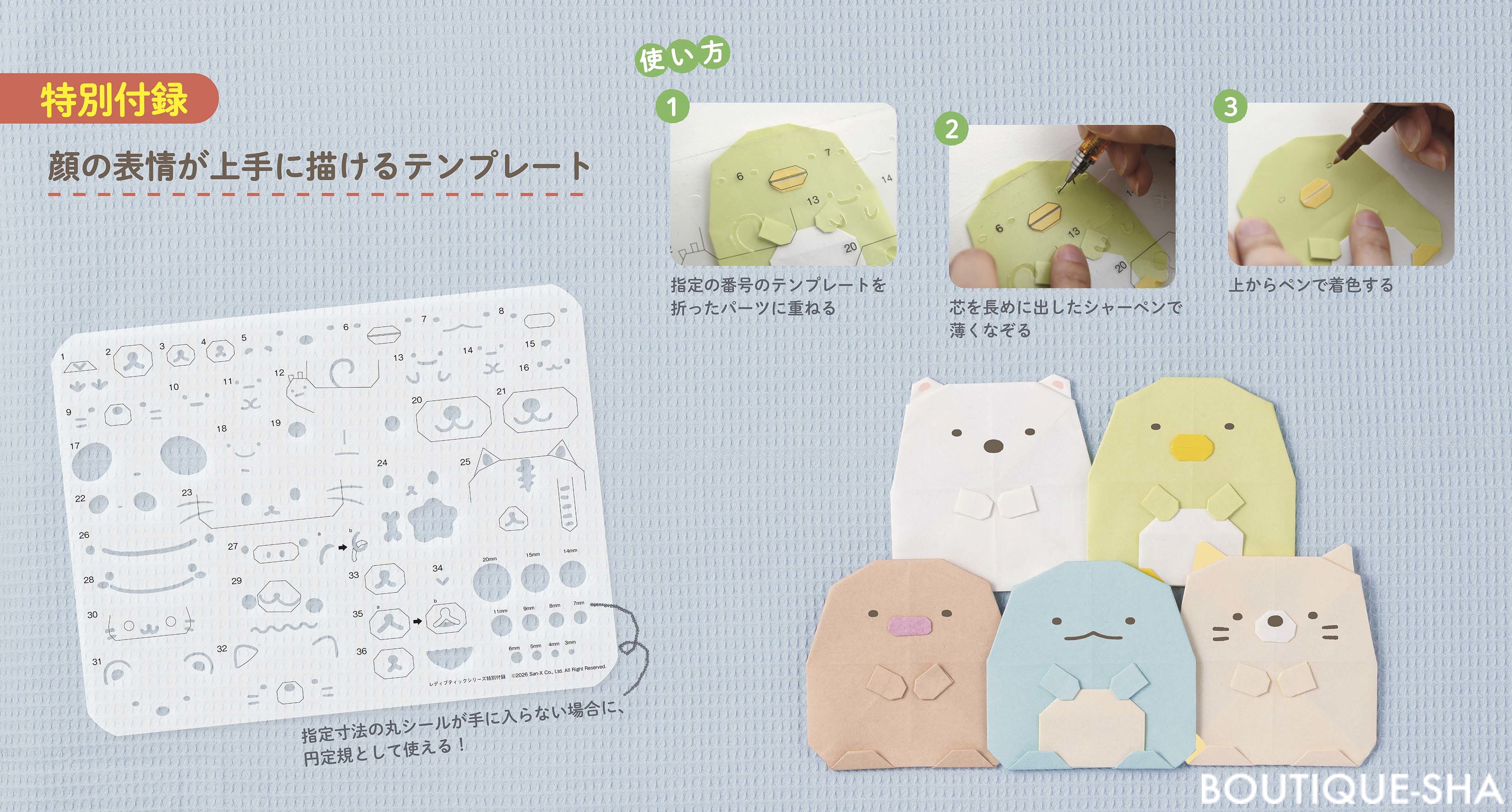 付録でついてくるテンプレートを使えば誰でもかわいい表情が描けちゃう!クリア素材なので、位置の確認も簡単で、繰り返し使うことができます。
